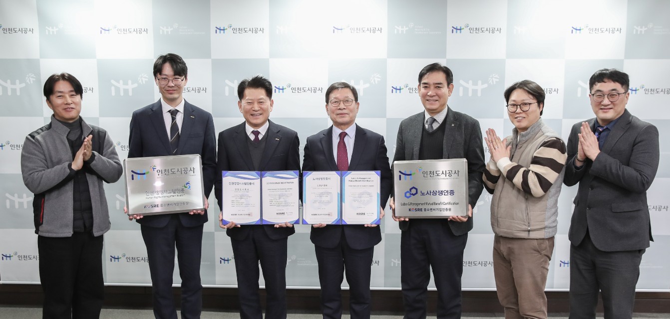 ○ 인천도시공사(iH, 사장 조동암)는 5일 인천도시공사 상황실에서 인권경영시스템(HRMS) 및 노사상생 인증(LMBC) 수여식을 개최하고, 지방 공기업, 출자·출연기관 최초로 두 인증을 동시에 획득했다고 밝혔다.