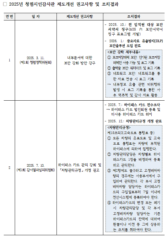 2025년 청렴시민감사관 제도개선 권고사항 및 조치결과