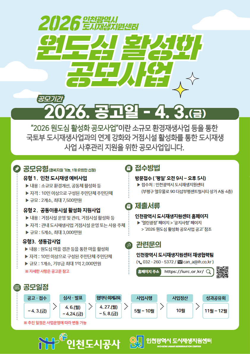 인천광역시 도시재생지원센터에서는 소규모 환경개선사업 추진을 통한 지역문제 해결 및 도시재생사업 완료(예정)지역 내 거점시설 운영 활성화를 위해 2026년 원도심 활성화 공모사업 참가단체를 다음과 같이 모집하오니 관심 있는 단체의 많은 참여 바랍니다.